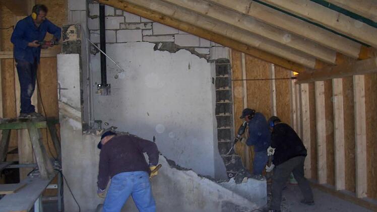 Natürlich sollte der Schulungsraum nicht nur für die Feuerwehr, sondern auch für die anderen Vereine nutzbar sein. Der Aufbau sollte eine Stehhöhe von zwei Metern haben, hell und freundlich werden. Schnell war klar, dass das Dach, das ohnehin undicht war, abgetragen werden muss, dass der Schlauchturm beseitigt werden muss. Vor zehn Jahren begannen die Floriansjünger mit der Arbeit.