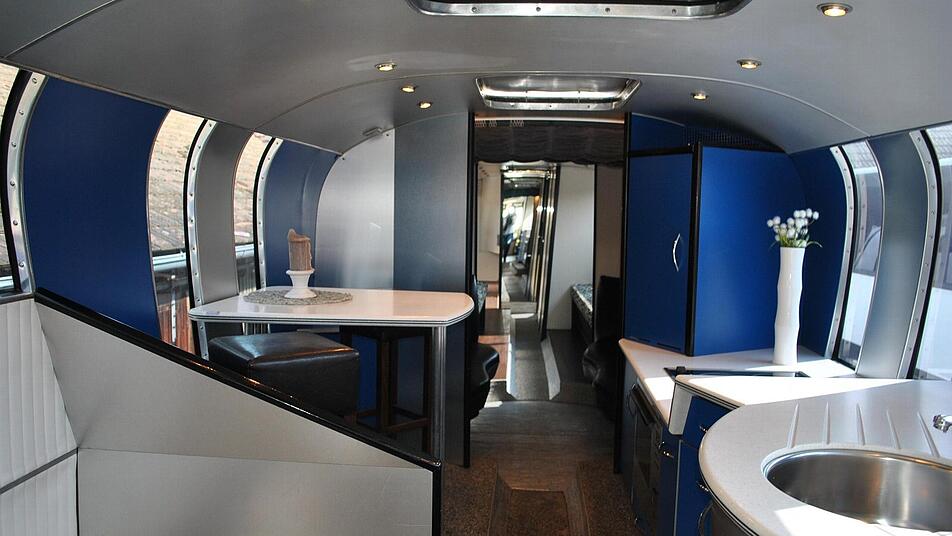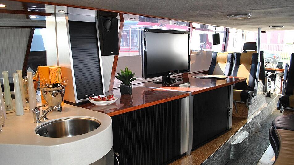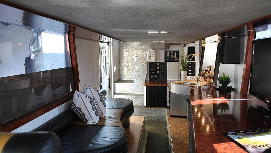 Der Clou: ein höhenverstellbares Bett, Flachbildschirme und eine High-Tech-HiFi-Anlage sowie eine komplette Küche mit Herd, Backofen und sogar mit Spülmaschine. Besonders stolz ist Mario Röttgen deshalb auf seinen Neoplan, weil einst nur elf Exemplare dieser Kolosse gebaut worden sind. Derzeit existieren noch drei. Und das Untersteinacher Eventmobil ist sicherlich das luxuriöseste Gefährt von allen.