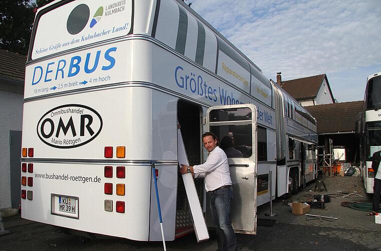 Das größte Eventmobil der Welt ist 18 Meter lang, 2,50 Meter breit, vier Meter hoch und 28 Tonnen schwer. Aus einem alten Doppeldecker-Gelenkbus hat der Untersteinacher Busunternehmer Mario Röttgen in mühevoller Umbauarbeit das Luxus-Gefährt gemacht.
