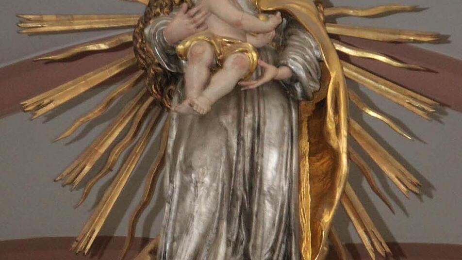 Wer das Gotteshaus betritt, hat die Kirchenpatronin nicht gleich im Blick. Im Gegenteil, man übersieht die Figur gerne, die in zehn Metern Höhe überm Altarraum schwebt. Aber die Madonna in barocker Anmutung, die das Jesuskind im Arm hält, ist nicht immer dort oben gewesen.