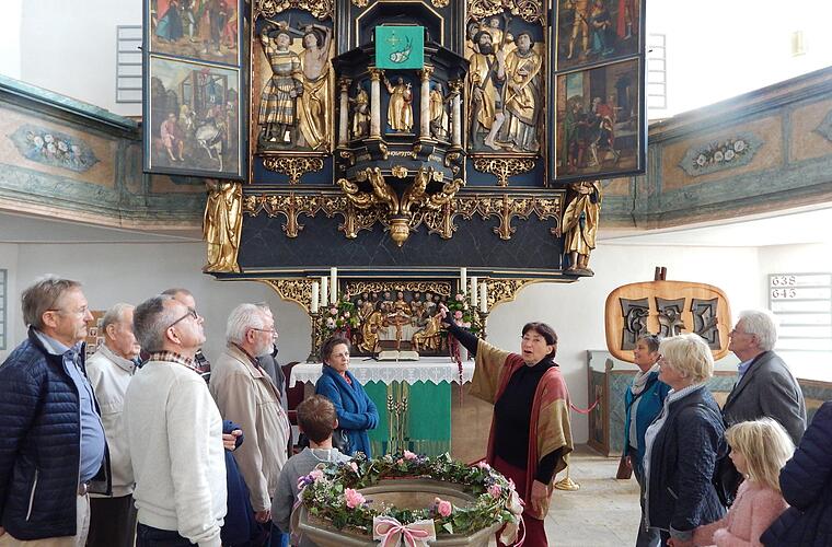 Neudrossenfeld eine zweite Station zum Denkmaltag: Die Kirche zählt mit dem Kanzelaltar, dem Stuck, dem wundervollen farbenprächtigen Deckengemälde und den Ledertapeten in der Adelsloge zu den schönsten Gotteshäusern der Region. Kirchenführerin Karla Fohrbeck konnte einer großen Zahl von Besuchern am gestrigen Tag des offenen Denkmals die Schönheiten und die Einmaligkeit dieses Gebäudes näherbringen. Es ist zusammen mit dem Schloss nebenan ein echtes Juwel.