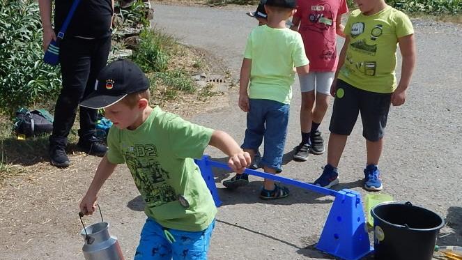 Sechs Stunden lang war der Nachwuchs mit 16 Betreuern aktiv, konnte an zwölf Stationen seine Fähigkeiten unter Beweis stellen, für die es Punkte zu sammeln galt. Den Schatz im Heuhaufen suchen, Kuhfladen (Gummiringe) werfen, Milchkannen-Rennen und das Hufeisen in einen Eimer zielen - das alles mussten die Teilnehmer. Außerdem stand auf dem Programm: Mit dem Trettraktor fahren, Gummistiefel-Weitwurf und Schubkarren-Transport. Vom großen Sandhaufen wurde fleißig in einen Eimer geschaufelt und dann gesiebt, eine heikle Aufgabe. Aber die Kinder meisterten das prima, sie waren überall mit Feuereifer bei der Sache.