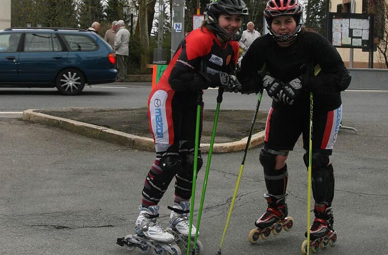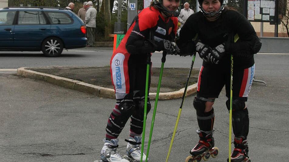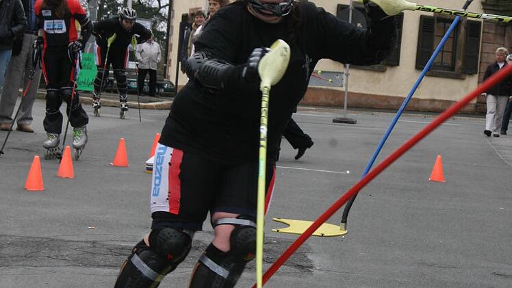 Vom Platz vor dem Rathaus stürzten sich die Skater bergab Richtung "Schwarzes Ross". Mit wendigen Bewegungen drückten die Skater die Slalomstangen zur Seite - wie Rosi Mittermaier in ihren besten Zeiten. "Die Stöcke sind dazu da, dass man die Slalomstangen wegdrücken kann", erklärte Christa Kraus (19).