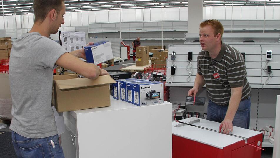 Reinkommen ist gar nicht so einfach. "Ich bin doch nicht blöd", einfach mal die Security gefragt. "Da ganz hinten, dort geht's rein", sagt der freundliche Mann und weist den Weg zum Personaleingang. Auf der Großbaustelle in der Mittelau, die durch die roten Plakate an der Fassade als neuer Media-Markt zu erkennen ist, wird mit Hochdruck gearbeitet. Der große Eingang ist - natürlich - noch zu, aber die kleine Tür an der Seite offen.