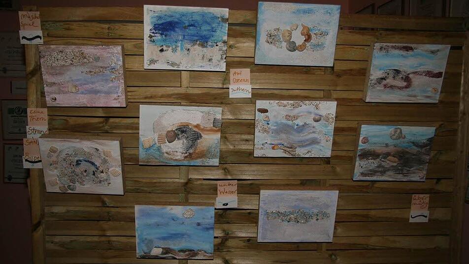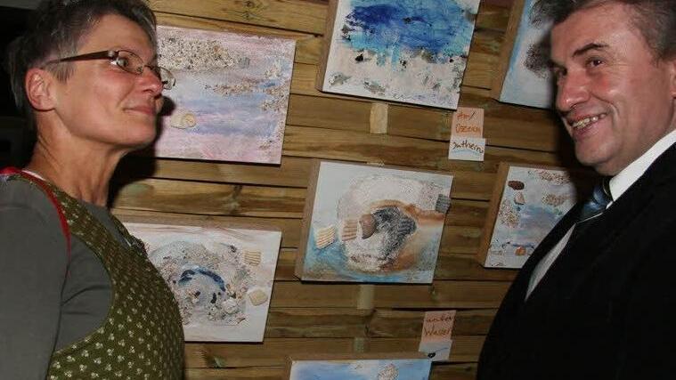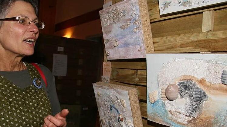 Auch der renommierte Landschaftsmaler Günther Wolfrum zeigte seine Bilder sowie Marianne Renke. Edina Thern präsentierte zum ersten Mal Sand- und Muschelbilder. Die Zutaten für die dekorativen Arbeiten stammen von einem Urlaub in Florida. Auch Schieferbilder, die mit Stoff kombiniert sind, hatte sie mitgebracht.