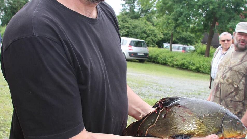 "Bei mir ist die Ausbeute auch nicht gut", verriet Sebastian Kuis (35). Er holte aus einem Eimer einen winzigen Fisch. "Das ist ein Hybrid", erklärte Kuis - ein Rotfeder-Mix. Ganze 140 Gramm brachte das Fischlein auf die Waage. Doch so winzig die Ausbeute auch war - der Mini-Fisch brachte Kuis noch unter die Top Ten. Denn von 67 passionierten und erfahrenen Anglern haben nur neun Erwachsene und fünf Jugendliche überhaupt einen Fang gemacht.