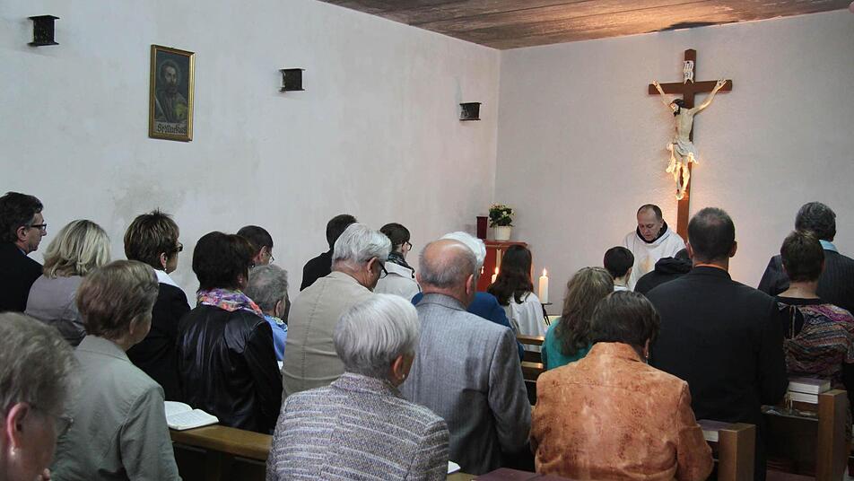 Doch wie feiert man Kirchweih, wenn die Kirche nicht zugänglich ist? Die Wartenfelser hatten vorgesorgt und ließen sich die Freude an der Kerwa nicht verderben. Sie lagerten die Kirchenbänke kurzerhand in eine ehemalige Fabrikhalle aus, die natürlich gesäubert und "festlich" ausstaffiert wurde. Ein beleuchtetes Kreuz dient als Blickfang hinter dem Altar. Vor einer Marienfigur waren Blumen aufgestellt - auf einem roten Teppich. Und von den Wänden blickten die vier Evangelisten aus Goldrahmen auf die Kirchenbänke. Eisenträger und Rohre sind mit Silberpapier verkleidet worden. Sogar eine Orgel wurde in die Halle geschafft, damit Otmar Föhr den Kirchweihgottesdienst musikalisch umrahmen konnte.
