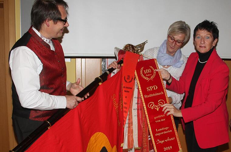 Normalerweise regieren im TSV-Sportheim die Vereinsfarben schwarz und gelb, doch beim Kreistreffen der SPD erstrahlte das Sportheim ausnahmsweise in Rot: rote Jacketts, rote Blusen, rote Schals, rote Krawatten hatten die Genossen zur Feier des Tages angezogen. Auf den Tischen wehten SPD-Fähnchen, und sogar die stolze Fahne des SPD-Ortsvereins wurde zur Feier des Tages ins Sportheim gebracht. Aus dem gesamten Landkreis pilgerten SPD-Genossen nach Stadtsteinach, um das Jubiläum "100 Jahre SPD Stadtsteinach" zu feiern. Die SPD-Kreisvorsitzende Inge Aures spendierte aus diesem Anlass ein Fahnenband.