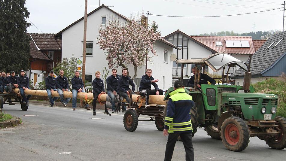 Die Schimmendorfer halfen den Danndofern sogar beim Einspannen des Maibaums. Denn der neue Baum wollte gar nicht in die Vorrichtung passen, sondern musste erst passend gemacht werden.