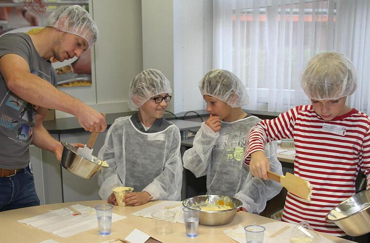 Finn Herber hatte sich einen weißen Mantel und eine Kopfbedeckung über die Haare gezogen. "Das gehört eben dazu", sagte er, als er sich mit seiner kleinen Schwester am Raps-Eingang anstellte. Er und die anderen Kinder zwischen sieben und elf Jahren konnten hier einen Tag lang die Welt der Gewürz- und Lebensmittelproduktion kennenlernen. "Ich mache jetzt einen Dip", erklärte Finn und kreierte gemeinsam mit den Raps-Lehrlingen eine fantasievolle Aufstrichvariation.