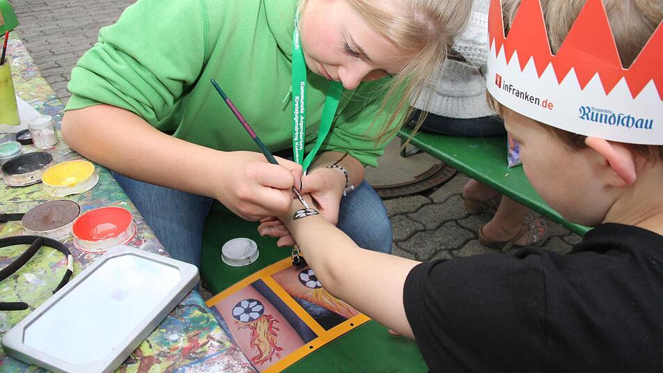 Damit die Kleinen auch zu Hause noch etwas vom Fest haben, können sie sich von den Mitarbeitern des Spielmobils Vögel, Blumen, Schmetterlinge oder Fußbälle ins Gesicht oder auf den Arm malen lassen. Und weil bei der Bayerischen Rundschau der Leser im Mittelpunkt steht, gibt es einen Stand, an dem sich die Besucher eine Seite mit ihrem Bild auf dem Titel ausdrucken lassen können.