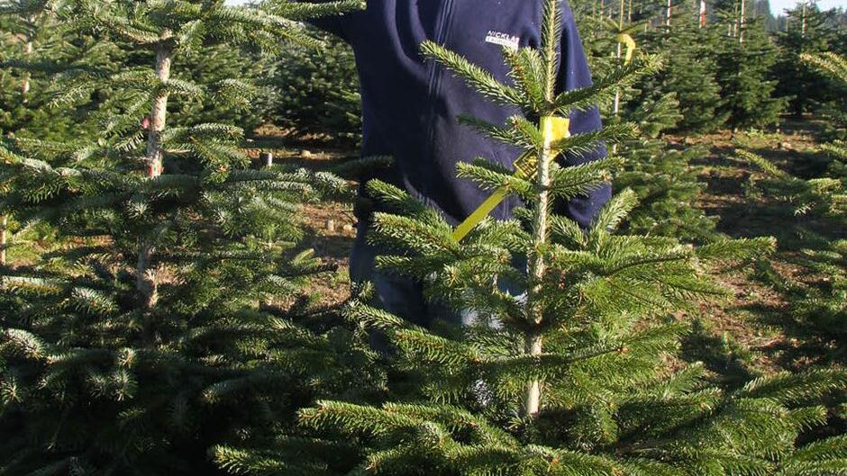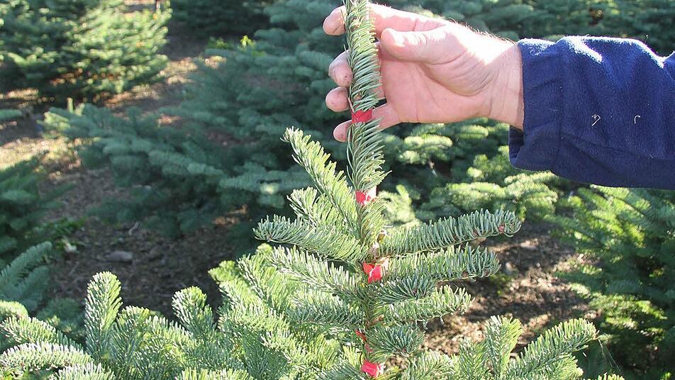 Manchmal muss man den Bäumen auf die Sprünge helfen, wenn ein Weihnachtsbaum aus ihnen werden soll. So wird bei Exemplaren, die keine Spitze ausbilden, ein Seitentrieb mit einem Bambusstecken hochgebunden. "Manchmal muss man auch die Triebe regulieren. Aber wir machen nichts am Terminaltrieb", sagt Witzgall, sondern zeigt nur Abstandshalter, mit denen Ungenauigkeiten korrigiert werden können. "Ein Baum, der formbeschnitten ist, der ist kein natürlicher mehr", sagt Witzgall und versichert, dass er die Finger von solchen Manipulationen lässt.