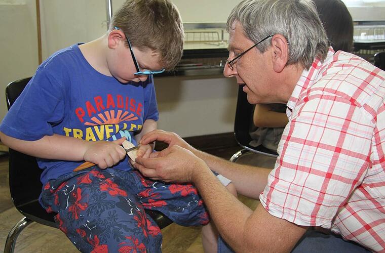 Bei Roland Friedrich indes stand der sachgerechte Umgang mit dem Schnitzmesser im Mittelpunkt. Denn bei der Verwendung eines Handschnitzmessers gilt die alte Weisheit, dass man nie auf sich zuschnitzen soll, nicht. Im Gegenteil: Die Kinder lernten, immer auf den Daumen zuzuschnitzen. Ganz anders werden die großen Schnitzmesser gehandhabt.