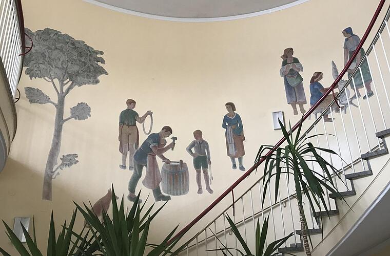 Für den Treppenaufgang wählt er eine figürliche, doch typisierende Darstellungsweise. Er zeigt zwei der ältesten Kulmbacher Zünfte: eine Büttnersfamilie beim Beschlagen eines Fasses, daneben rechts eine Frau am Spinnrocken mit zwei Helferinnen. Die Szenerie wirkt geruhsam, gänzlich unhektisch. Der Künstler verwendet erdiges Grünbraun, das durch das zarte Ocker der Wand abgetönt wird. Die Gestalten sind schlicht frontal und im Halbprofil gemalt. Gezeigt werden also gewöhnliche Menschen mit einfachen Grundgesten des bürgerlichen Fleißes und der gemeinsamen Anstrengung.