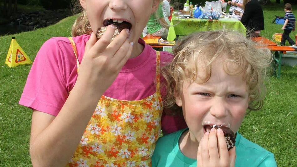"Der Mohrenkopf ist in hohem Bogen ins Gras geflogen, aber man kann ihn trotzdem noch essen", erklärt Katharina Weith (8), die mit ihrem Bruder einen Negerkuss verspeiste, das Prinzip der Schleuder.