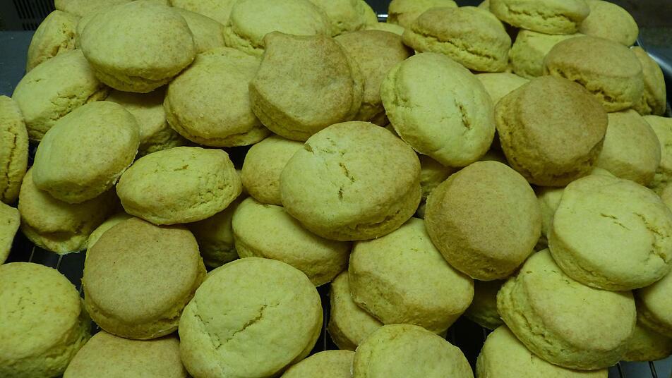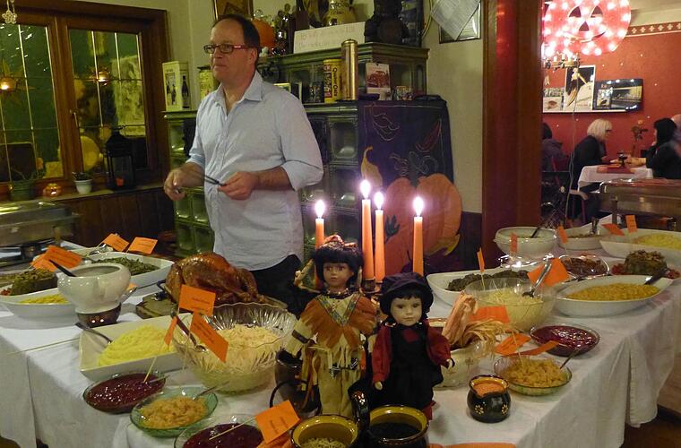 Neben dem gefüllten Truthahn gibt es viele amerikanische Gerichte: Mashed Potatoes (Kartoffelstampf), selbstgebackene Biscuits (Brötchen), String Beans (Bohnengemüse), Cranberry Chutney (Preiselbeer-Marmelade) und natürlich jede Menge verschiedener Kuchen: Apple Pie (Apfelkuchen), Pumpkin Pie (Kürbiskuchen), Pecan Pie (Nusskuchen). "Das ist eine Wahnsinns-Arbeit", sagt Hammond, den viele durch seine Arbeit als Chiropractor am