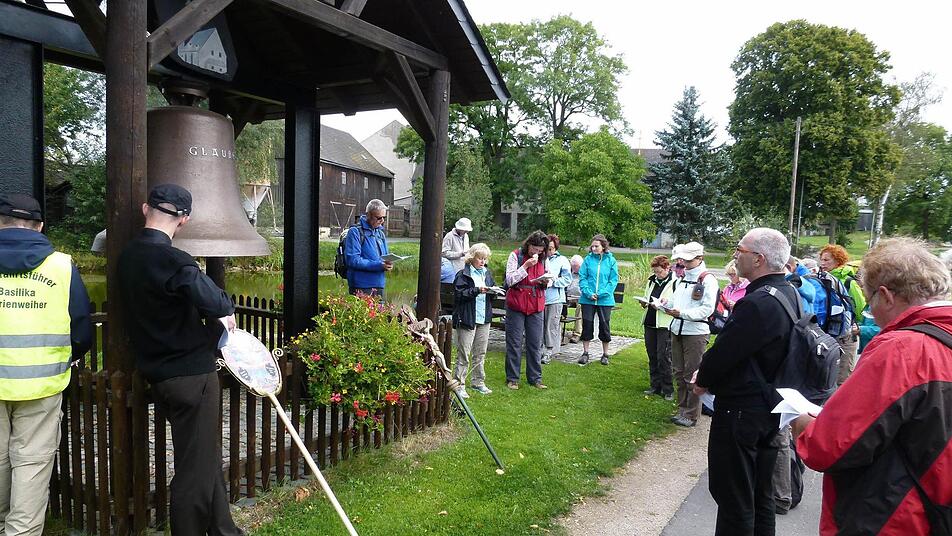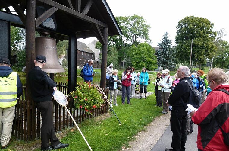 Die erste Etappe führte Reiner Meisel aus Marktleugast von Eger bis Thiersheim (25,5 Kilometer). Der zweite Abschnitt verlief bis Zell am Fuß des Waldsteins (30,2 Kilometer) und der dritte bis zur Marienwallfahrtskirche in Marienweiher (19,5). Jörg Schmidt vom Pilgerbüro Marienweiher hatte wieder alles prächtig organisiert. Zum Auftakt übergab er im Namen der Basilika-Freunde ein eigens angefertigtes Wallfahrtsbild mit den Abbildungen der beiden Motive auf der Egerer Fahne und in der Basilika sind. Diese Fahne ist heuer 150 Jahre alt geworden.