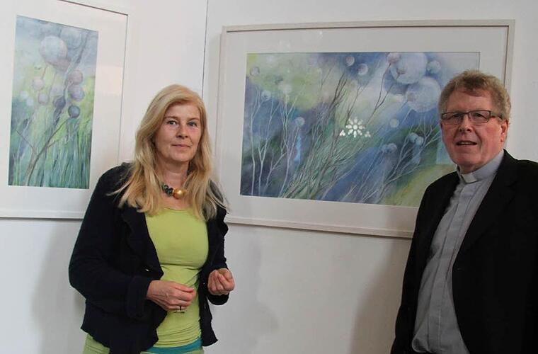 Zarte Kunstwerke von Cornelia Morsch in Blau-Nuancen wurden mit sanften Orgeltönen präsentiert.