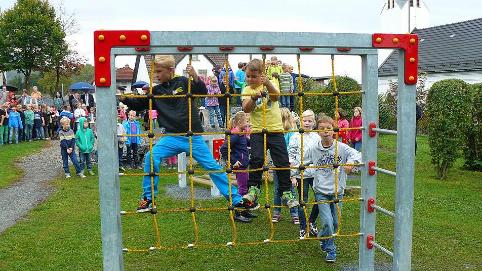 Der triste asphaltierte Pausenhof an der Grund- und Mittelschule Stadtsteinach ist Vergangenheit. Ab sofort können sich die Kinder zwischen den Schulstunden auf einer Wackelbrücke oder am Klettergerüst austoben. Bei einer kleinen Einweihung nahmen die Jungen und Mädchen die neuen Spielgeräte auf der Grünfläche vor der Nordeck-Spielruine in Beschlag.