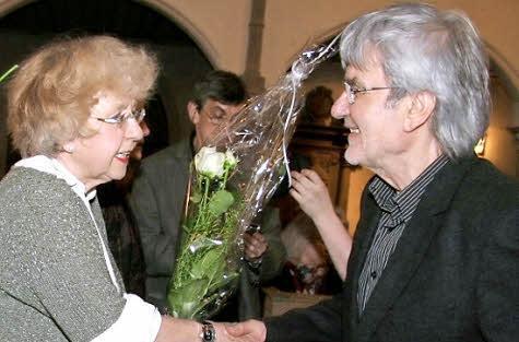 Blumen für die Ehefrau Horst Lohse ist aber nicht nur Komponist. Er war als Grundschullehrer in Bamberg tätig, Lehrbeauftragter an der Hochschule für Musik in Würzburg. Stadtrat Eddi Trapper erinnerte an die Stationen des Kulmbachers und freute sich über das Konzert, das zu seinen Ehren initiiert worden ist. Während musikalisch Horst Lohse mit seinen drei Liedern "To the river", "Eldorado", "A dream" nach Gedichten von Edgar Allan Poe den Ton vorgab, stahl dem Komponisten die eigene Ehefrau Sabine Lohse, Tochter des Künstlers Caspar Walter Rauh, die Schau: Sie hatte am Konzertabend Geburtstag und heimste deshalb den Blumenstrauß ein. Der Ehemann nahm es gelassen, denn seine Musik prägte den Abend.