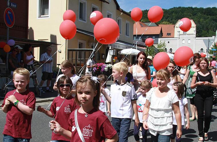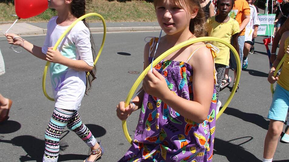 Und dann folgten die Klassen. Jede Klasse hatte sich etwas anderes ausgedacht. Die Vorschulkinder trugen stolz ihre Schulranzen zum ersten Mal in der Öffentlichkeit. Die Flexiklasse hatte sich in Zirkustiere verwandelt. Der Grund: Im Mönchshofgarten wollten die Buben und Mädchen Zirkusvorführungen zeigen.