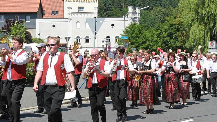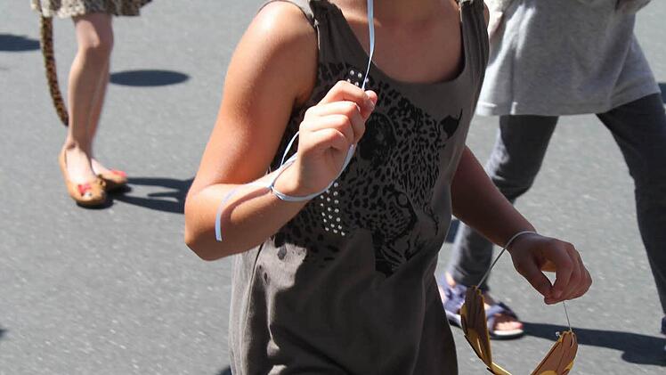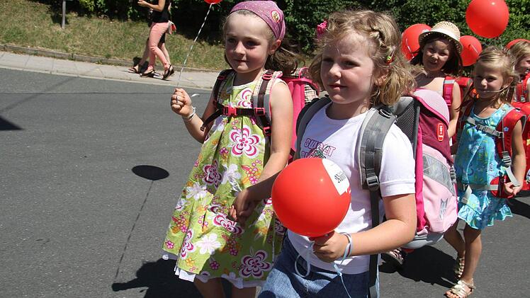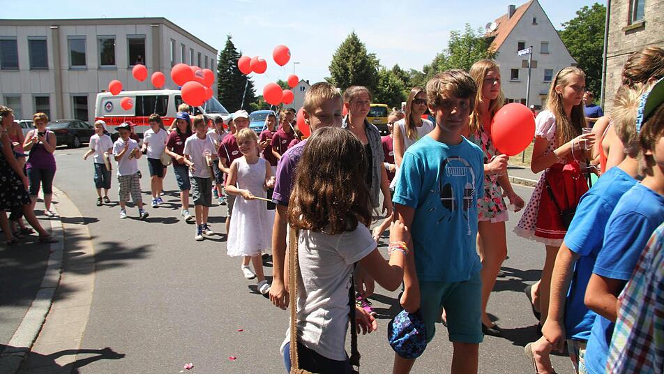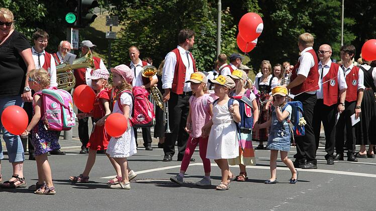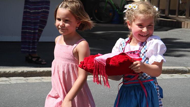 Die sieben Jahre alte Lia-Sophie Buchwald aus der ersten Klasse hat sich für das 100. Blaicher Wiesenfest extra ein neues Dirndl gekauft. Sie hat sich Blumen ins Haar gesteckt, denn sie wollte ganz besonders hübsch aussehen. Schließlich hatte sie die ehrenvolle Aufgabe, das gepolsterte Kissen mit dem roséfarbenen Fahnenband zu tragen und den Festzug anzuführen. Hinter ihr marschierten der Musikverein Burghaig, die Schulleitung und die Ehrengäste.