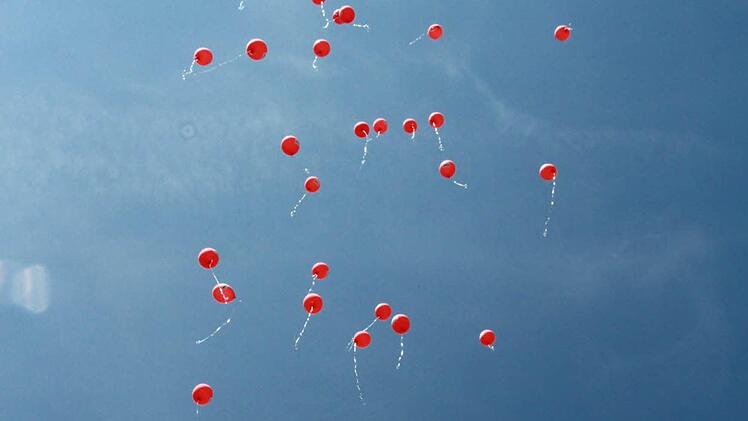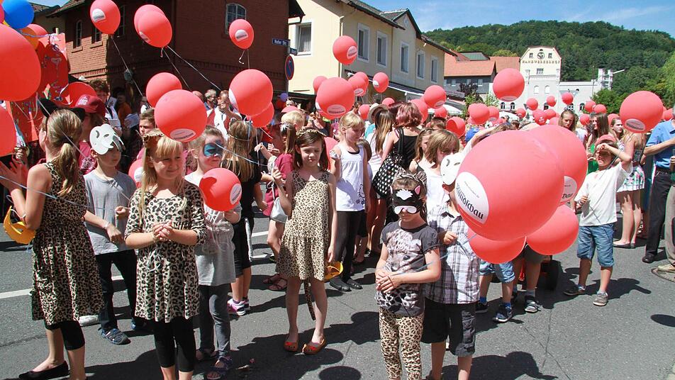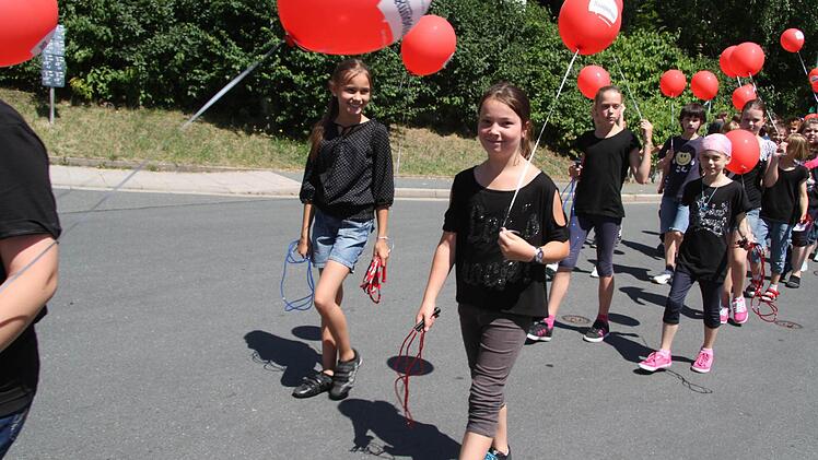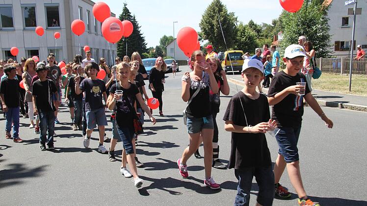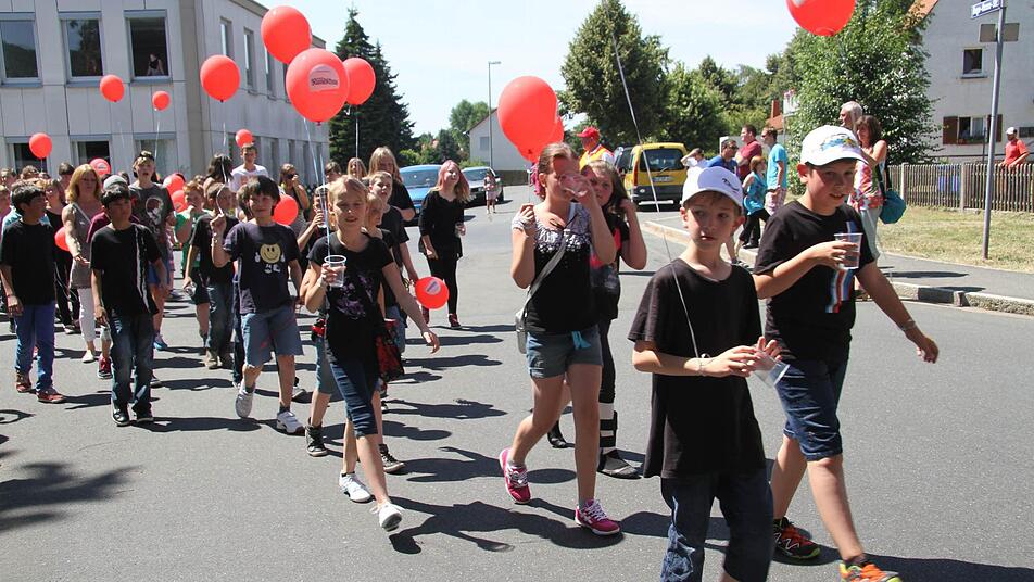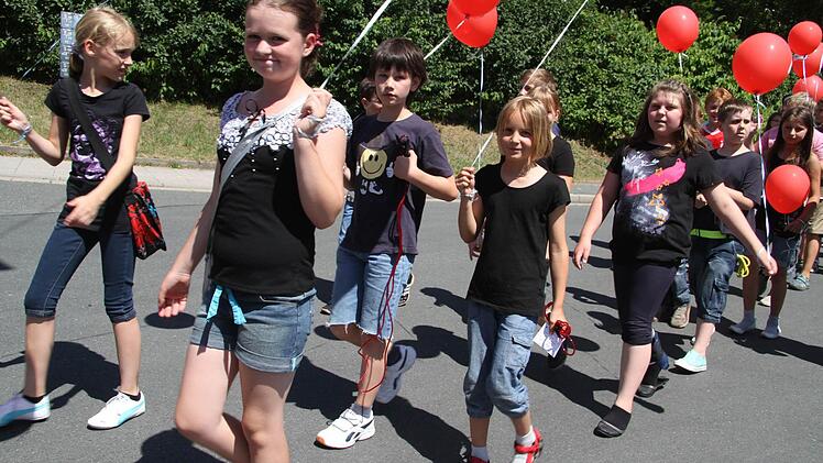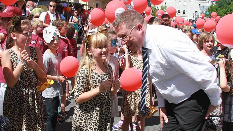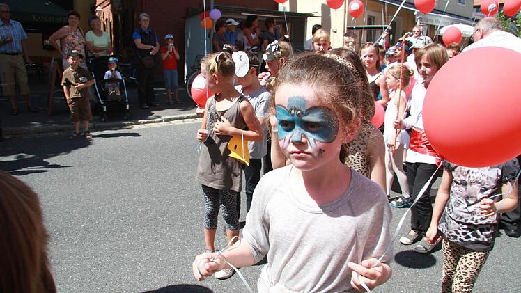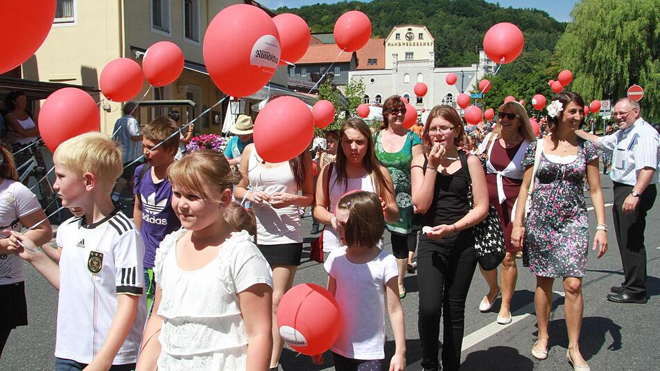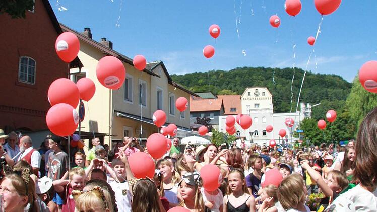 Richtig los ging das Fest für die großen und kleinen Wiesenfestbesucher, als alle vor dem Mönchshof-Garten die Bayerische-Rundschau-Luftballons in den Himmel steigen ließen und nachdem Oberbürgermeister Henry Schramm mit seinen Stadträten das Fahnenband an die Wiesenfestfahne geheftet hatte. Aus vollem Hals sangen die Blaicher Schüler das Frankenlied und das Kulmbachlied. Denn das gehört ebenso zum Blaicher Weisenfest wie die Bratwürste. Und die spendierte auch beim 100.