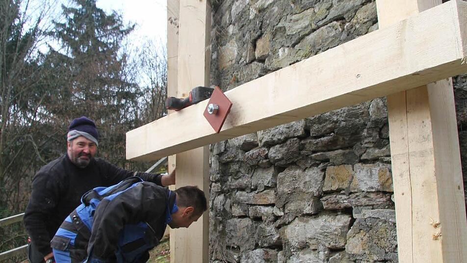 Allein die Eisenstangen wiegen 300 Kilogramm. Die Kanthölzer nehmen vier Kubikmeter ein, jede einzelne Stütze wiegt mehr als 150 Kilogramm. Kranfahrer Walter Deuerling lässt viel Fingerspitzengefühl walten und reagiert auf jeden kleinen Fingerzeig, den ihm Zimmermann Harald Gräf gibt. Indes "turnt" Jonas Janorschke auf der Burgruine herum. Er hat im Inneren des Turms eine Arbeitsbühne aufgestellt.