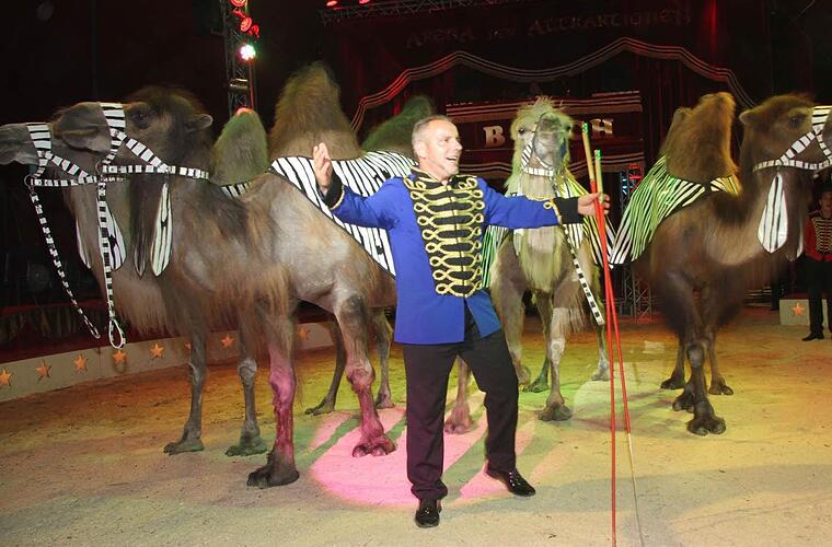 "Arena der Attraktionen" nennt sich der Zirkus Paul Busch. "Wir möchten keine Sensationen, sondern wir möchten eine buntes Programm für Familien bieten", sagte Chef Henry Frank bei der Premiere in Kulmbach. Deshalb verzichtet der Traditionszirkus auf wilde Tiere - doch Kamele, Pferde, Mini-Ponys, Hunde, Ziegen und Rinder verschiedenster Länder sind mit von der Partie.