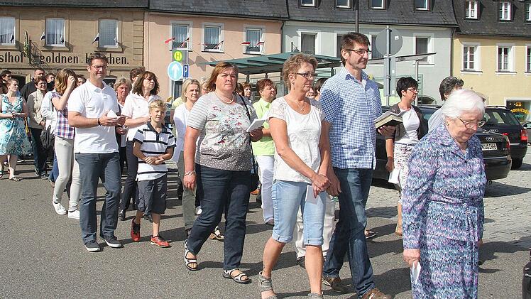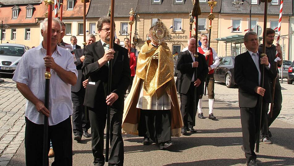 Die Zeiten, in denen das Fronleichnamsfest die Menschen entzweite, sind vorbei: Von der großen Prozession in Stadtsteinach fühlten sich katholische Christen ebenso angezogen wie evangelische. Bei herrlichem Sommerwetter zogen sie am Donnerstag durch den Ort und beteten an vier Altären. Auch Landrat Klaus Peter Söllner und Bürgermeister Roland Wolfrum sowie zahlreiche Stadträte waren dabei, außerdem viele Gruppen und Vereine.