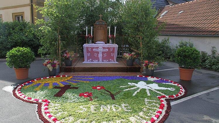 Der stattliche Zug bewegte sich vom Kirchplatz über den Marktplatz bis zum ersten Altar in der Bahnhofstraße. Direkt unter dem Kreuz bauen Brigitte Lanzendorfer und Greta Eckert alljährlich einen Altar auf, legen einen roten Teppich auf ein Podest. Dann zog die Prozession weiter Richtung Dammweg zur kleinen Kapelle der Familie Partheimüller und zum Altar der Kolpingfamilie vor der Sparkasse. Asoluter Höhepunkt war der vierte Altar auf dem Kirchplatz mit einem 3,50 mal vier Meter großen Blütenteppich , der von der Feuerwehr Stadtsteinach gestaltet wurde.