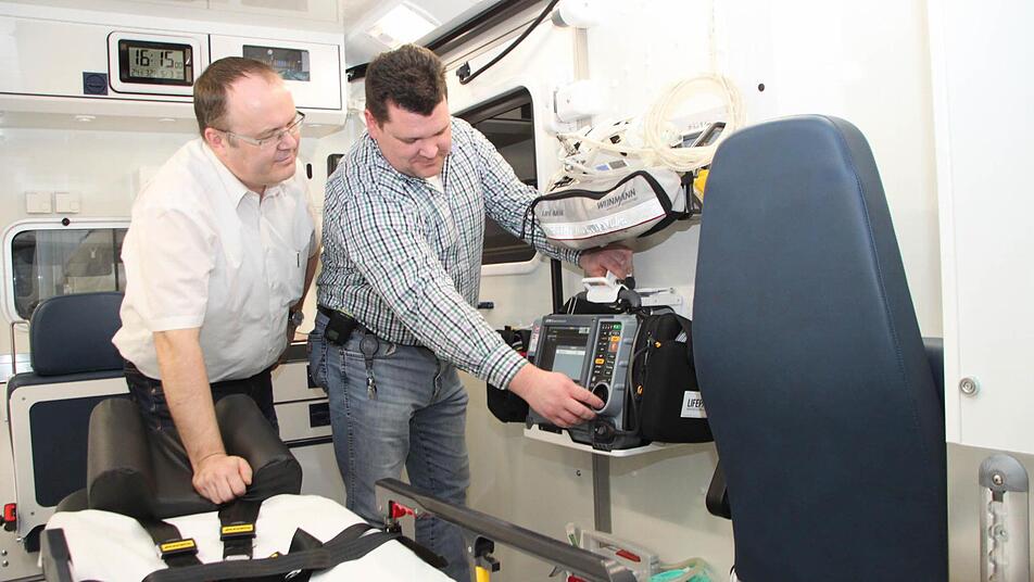 BRK-Rettungsdienstleiter Michael Martin (links) und der Beauftragte für Medizinprodukte, Jochen Fischer, kümmern sich darum, dass die Ausrüstung im Rettungswagen passt. Foto: Stephan Tiroch