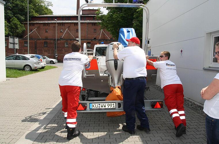 Neoprenanzüge, Trage und Kleidung sind im Einsatzfahrzeug verladen. Ein kräftiger Schubs, dann ist auch der Anhänger mit dem Boot angekuppelt. Es kann losgehen.