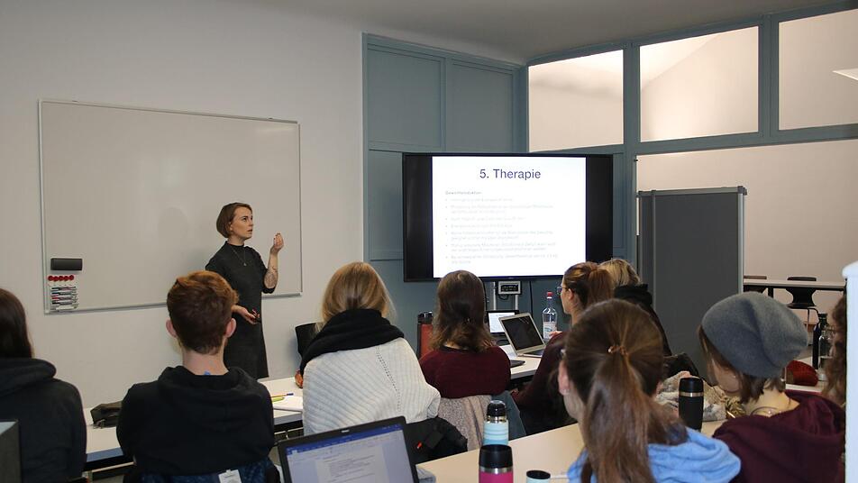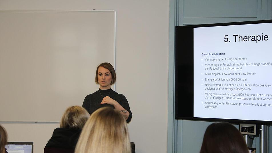 Das erste Wissen, das auf dem geplanten Campus in Kulmbach vermittelt wird, sind verschiedene Therapieformen zur Gewichtsreduktion. Rund 30 Studierende haben trotz winterlicher Wetterlage den Weg in die ehemalige Verwaltungsvilla der Kulmbacher Spinnerei gefunden. Das Interesse am Thema scheint groß zu sein, wie sich an den vielen Einwürfen und Fragen der Lernenden zeigt.