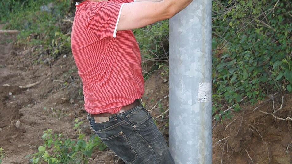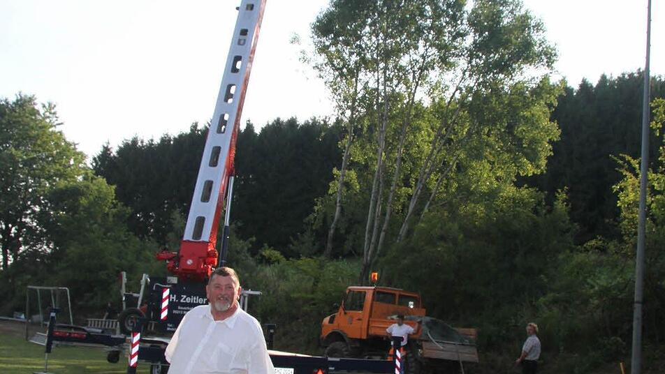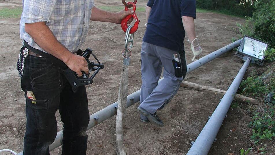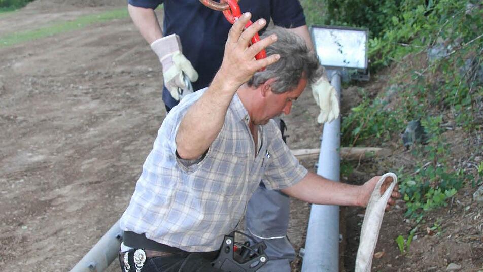 Ein Teil verschwindet in der Erde In einer abendlichen Arbeitsaktion konnten die Helfer dann die Flutlichtmasten befestigen und installieren. Ganz ohne schweres Gerät allerdings ging das nicht. Horst Zeitler stellte seinen Dachdeckerkran zur Verfügung. Und dieser Kran, der bis zu 1,6 Tonnen schafft, hievte die 340 Kilo schweren Masten in die vorgesehenen Röhren, wo sie dann einzementiert wurden. Ein Siebtel der 18 Meter hohen Masten verschwindet im Erdreich, damit die Riesen auch standfest sind. Jetzt müssen die Masten nur noch angeschlossen und richtig ausgerichtet werden.