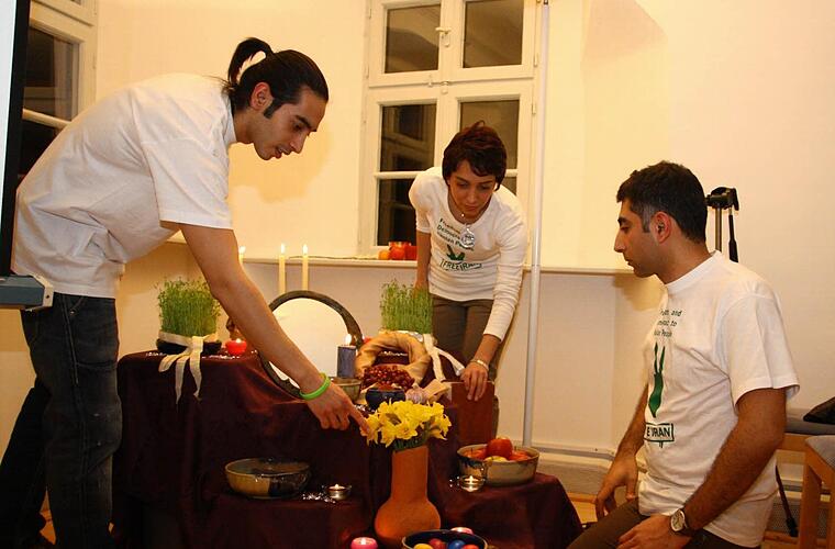 Liebevoll haben die Iraner auf einem Tisch ihr "Haft Sin" arrangiert. Und während sie erzählen und Nader Rezazadeh aus Bayreuth für die stimmungsvolle musikalische Untermalung sorgt, werkelt in der winzigen Küche Leila Teimouri, Javad Ahmadi arrangiert ein Buffet. Ein Reisgericht mit traditionellen Gewürzen und Fleisch soll es geben, ein Dessert, das nach Äpfeln und Mandeln schmeckt und intensiv nach Rosenwasser duftet, dazu Tee und Gebäck. Dass ihre Gäste reichlich bewirtet werden, ist der kleinen Gruppe von Flüchtlingen wichtig. Auch das ist schließlich Brauch zum Nouruz-Fest.
