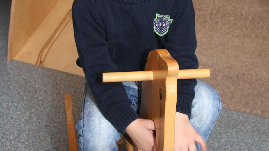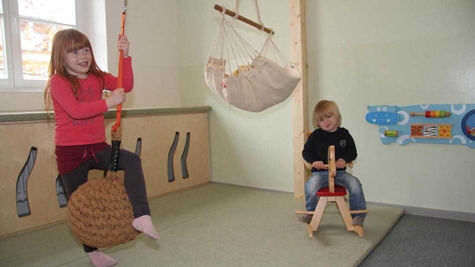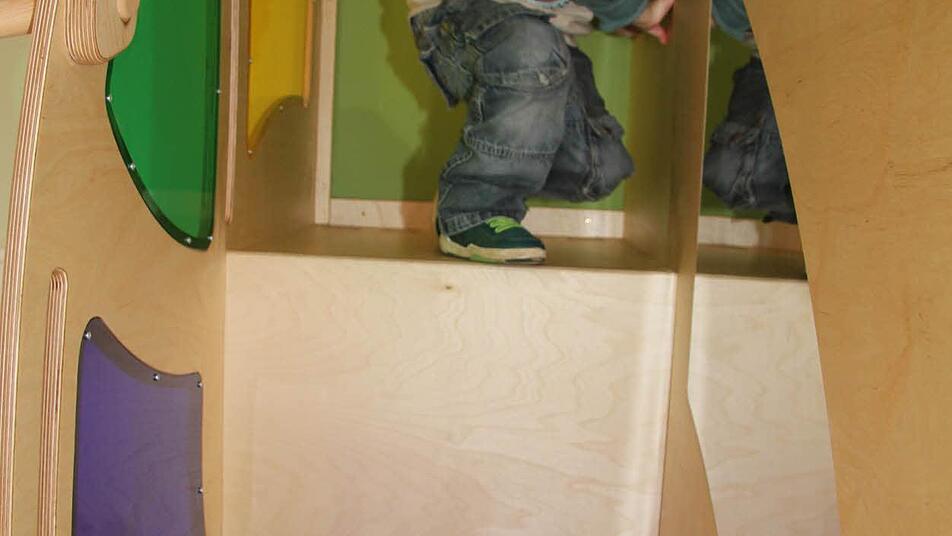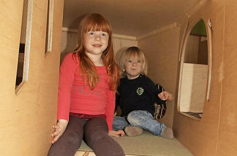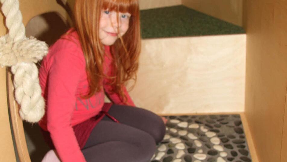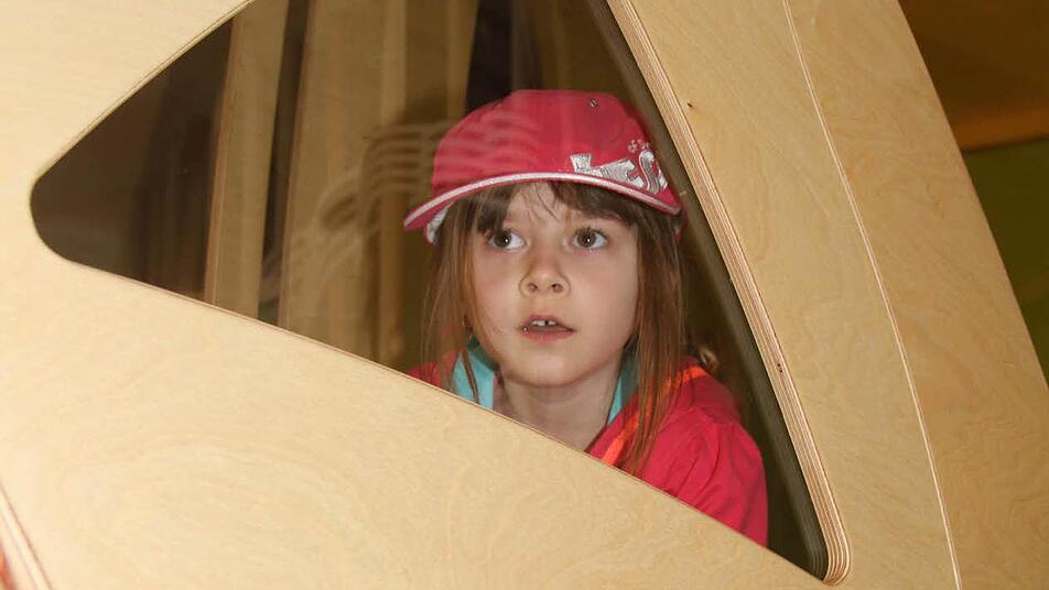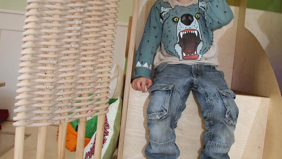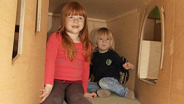 Paul Niederstraßer (2) sitzt gemütlich in einem Schaukelpferd, wähend seine große Schwester Mia (5) bereits die große neue Spiellandschaft im Familiencafé erkundet. Sie rutscht die kleine hölzerne Rutsche herunter, fühlt mit den Händen das Mosaik. Paul zögert nicht lange, klettert aus dem Schaukelpferd heraus und macht es seiner Schwester nach. Schließlich ist in der handgefertigten hölzernen Spiellandschaft alles so gestaltet, dass auch er schon ohne Probleme und ohne Gefahr bis ganz nach oben klettern kann: über schräge Rutschen und flache mit Teppich ausgelegte Treppen.