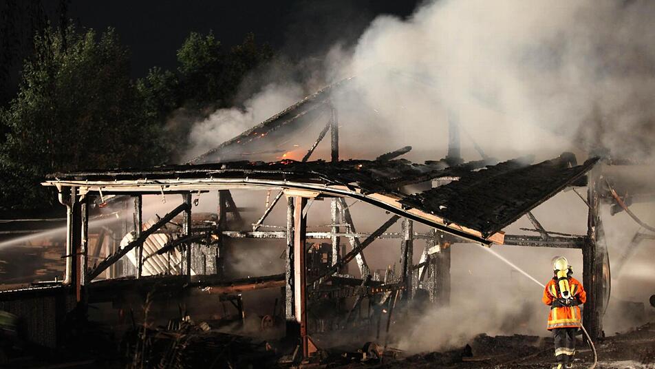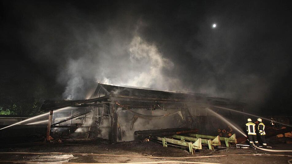 Die Produktionshalle eines Sägewerkes am Ortsrand von Marktschorgast im Landkreis Kulmbach ist bei einem Großfeuer am Sonntagabend völlig niedergebrannt.