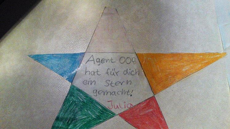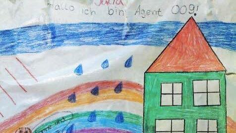 Er fischt eine Flaschenpost aus der Steinach. Geöffnet hat er sie nicht. Das hat Hermanita Espig übernommen. Zu Tage kamen Bilder und Briefe von Agent 009 und Agent 012. Am 31. März 2013 hatten die beiden Nachwuchs-Bonds Bilder gemalt und abgeschickt. "Weit ist die Post nicht gekommen, aber schön sind die Zeichnungen", ist Hermanita Espig ganz begeistert.