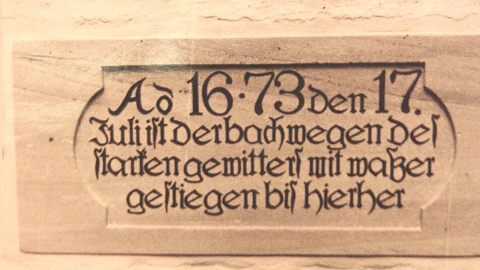 Eine Inschriftentafel aus Sandstein am Kulmbacher Rathaus zeigt, dass die Stadt auch früher schon unter Hochwasser zu leiden hatte.