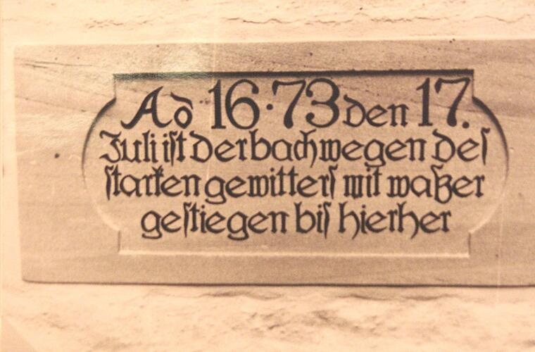 Im Einvernehmen mit den Hausbesitzern konnte die Tafel von dort an die Südseite des Rathauses gebracht werden. Sie Tafel erinnert an eine Überflutung Kulmbachs, von der auch in der von A.W. Heckel verfassten Stadtchronik berichtet wird.