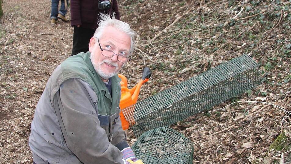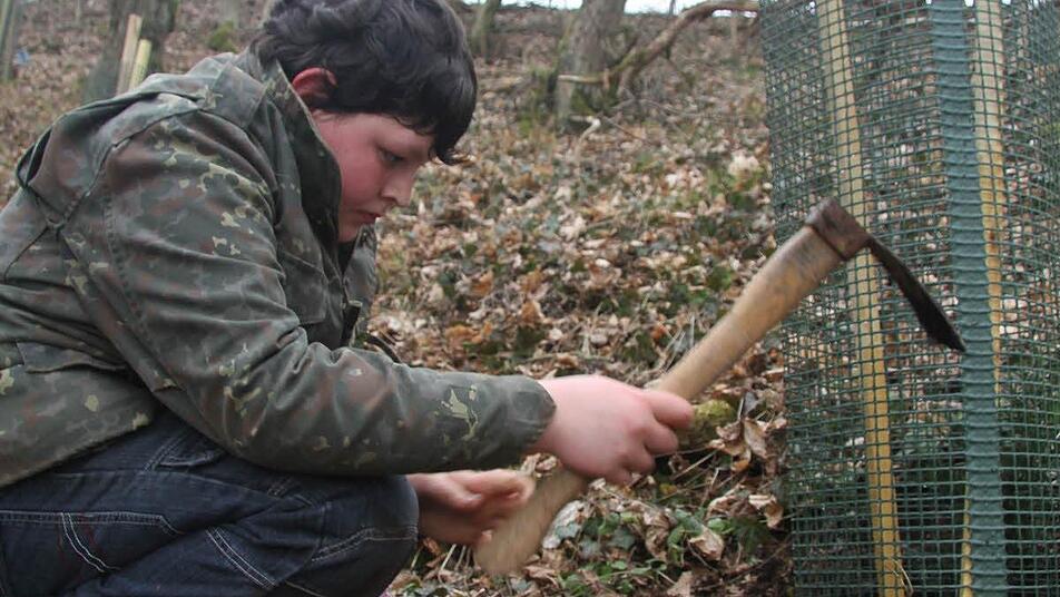 "Ich habe schon fünf Eiben gepflanzt", erklärt Kai Petschke stolz und greift nach der Umzäunung. Denn die Schüler wissen: Die jungen Eiben müssen vor Rehen geschützt werden. "Eiben sind wie Schokolade. Rehe lieben sie", hatte Anja Mörtlbauer erklärt.