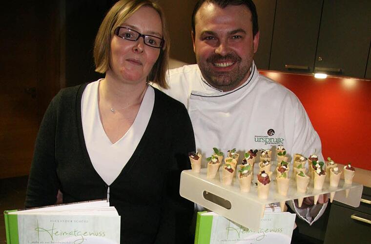 Frische ist die Passion, die Feinschmeckerkoch Alexander Schütz liebt und lebt - nicht nur in der Küche, sondern offenbar auch in anderen Bereichen des Lebens. Sein erstes Kochbuch "Heimatgenuss - mehr, als nur Broudwärscht" wurde erst zwei Stunden vor der offiziellen Präsentation angeliefert, von Drucker Markus Kreiter aus Wolfratshausen persönlich. Doch aus der Ruhe ließ sich Schütz davon nicht bringen.