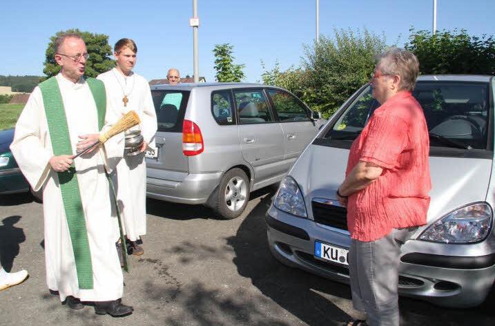 Dekan Hans Roppelt selbst kam zur Fahrzeugsegnung mit dem Rad aus Stadtsteinach nach Untersteinach - und sein eigenes Rad bekam eine gehörige Portion Weihwasser ab.