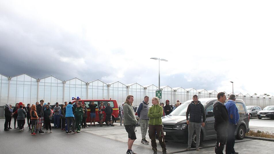 Das Horrorszenario, das sich Kreisbrandinspektor Stefan Heidenreich mit seinem Team für den Probealarm ausgedacht hat, ist damit aber noch nicht am Ende: Denn in den Gewächshäusern sollte der Erntebetrieb in vollem Gang sein: wie an jedem normalen Samstag. 72 Mitarbeiter sind im Einsatz. Über die Be- und Entlüftungsanlage könne eine viel zu hohe Kohlendioxidkonzentration in die Gewächshäuser gelangen. Kurzum: Die Gewächshäuser müssen so schnell wie möglich evakuiert werden.