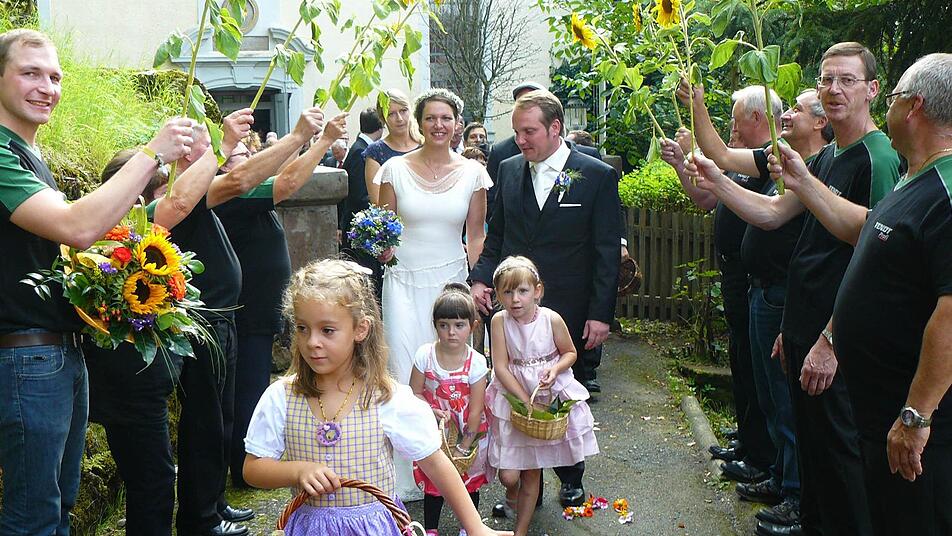 Vor der Kirche wartete bei schönem Sommerwetter ein großes Spalier. Die Glückwünsche des Fendt-Clubs Zettlitz sprach Martin Baumgärtner aus. Mit einem Ständchen erfreuten die Kindergartenkleinen aus Fölschnitz die Frischvermählten. Brigitte Sentis-Herr gratulierte zur Vermählung.