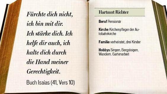Eigentlich hat Hartmut Richter keinen Lieblingsbibelspruch, den er allein über alle Aussagen der Bibel stellen könnte. "Die Bibel ist für mich ein von Gott inspiriertes Werk und in ihrer Gesamtheit die Offenbarung des Wortes Gottes, das von Propheten, Gelehrten, Zeugen und Aposteln unter Einfluss des Heiligen Geistes niedergeschrieben wurde", so Richter.