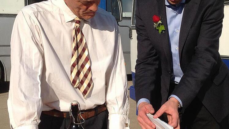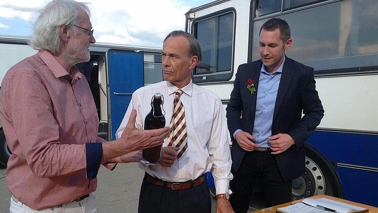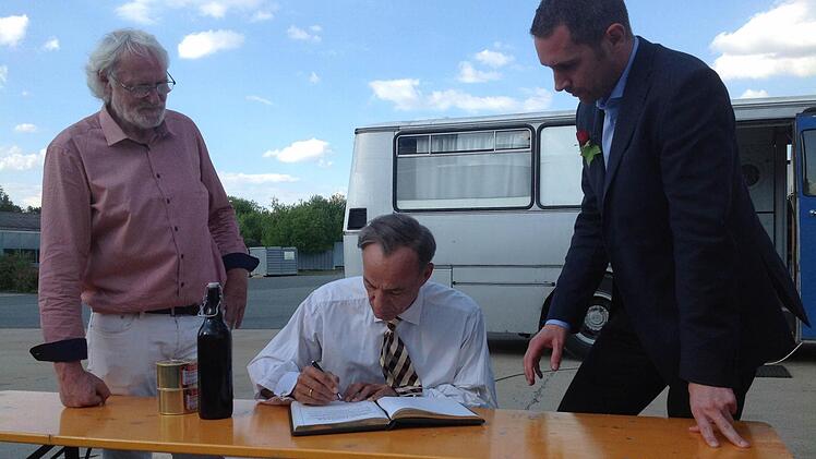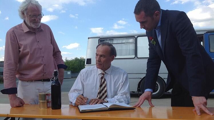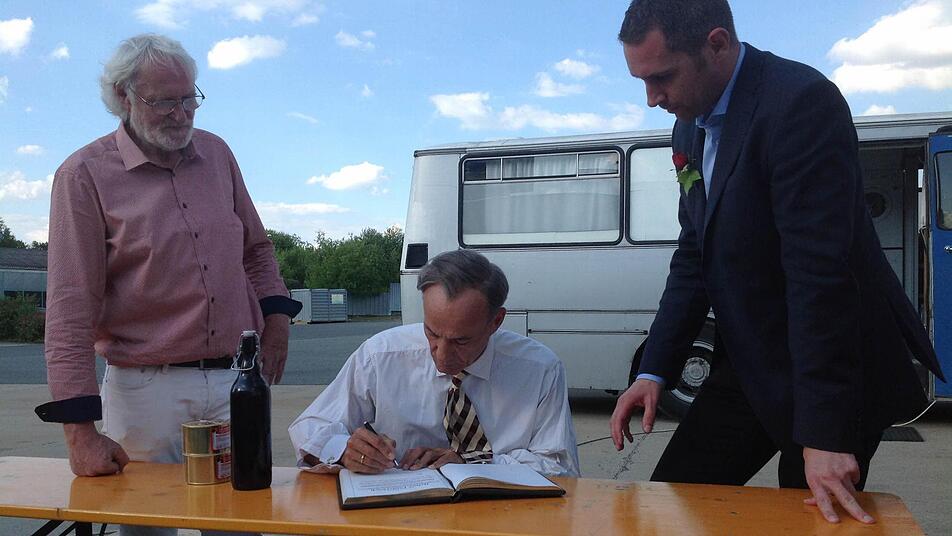 Heiner Lauterbach war gut aufgelegt, als er gestern Abend Bürgermeister Martin Bernreuther (CSU) und seinen Stellvertreter Veit Pöhlmann (FDP) traf. Der bekannte deutsche Schauspieler trägt ein weißes Hemd und Krawatte und nimmt sich entgegen der Ankündigung der Filmcrew weit mehr als nur zwei Minuten Zeit für die beiden Kommunalpolitiker. Aufmerksam liest er den Text im Gästebuch, ehe er seinen Namen darunter setzt. Dann gibt es noch fränkische Spezialitäten für den Star: ein Bier der Kulmbacher Kommunbräu und zwei Wurstdosen samt Bierdeckel der Pöhlmannschen Gastwirtschaft.