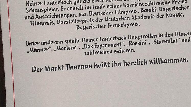 Der bekannte Schauspieler ist für Filmaufnahmen in der Gemeinde im Landkreis Kulmbach. Dort entstanden Szenen für den ZDF-Dreiteiler "Tannbach". Lauterbach trug sich auch ins Gästebuch des Marktes Thurnau ein.