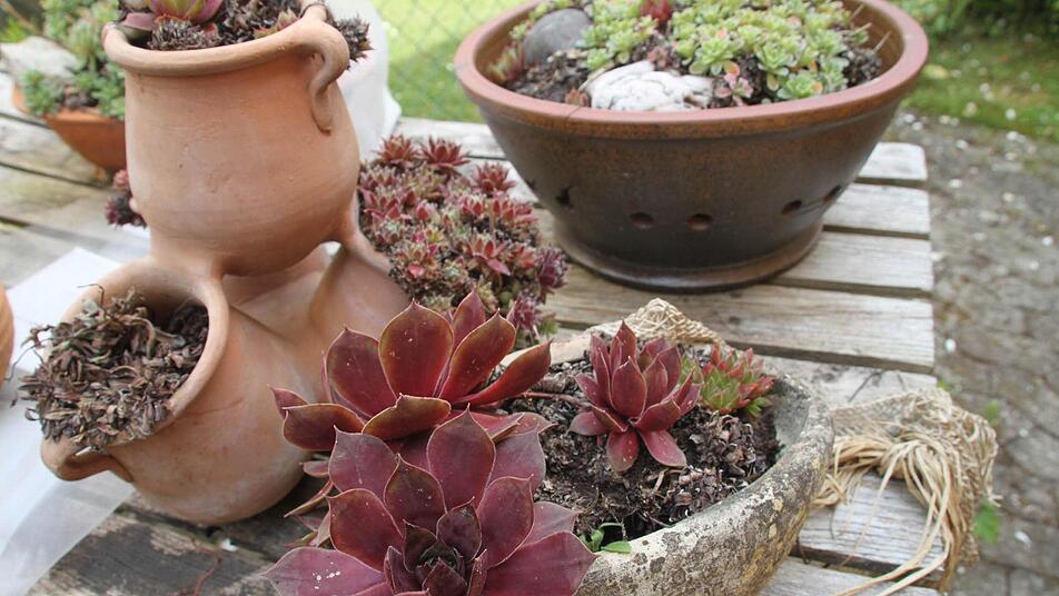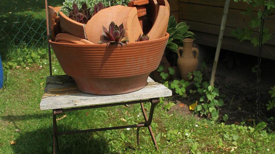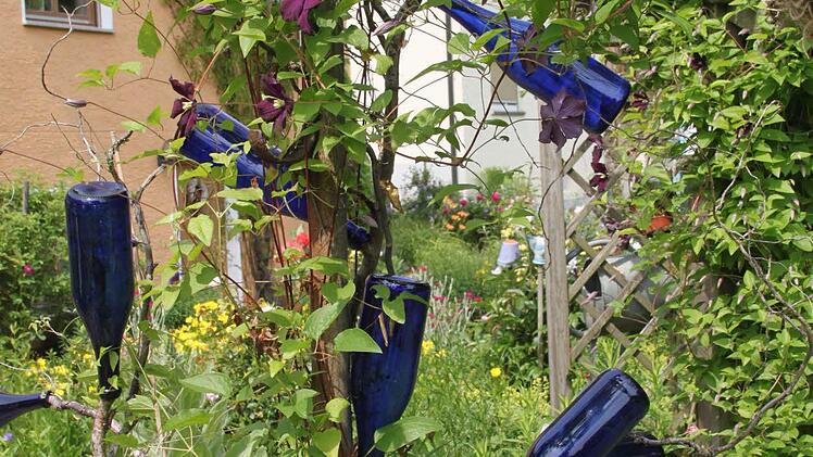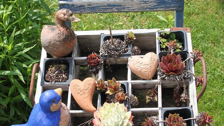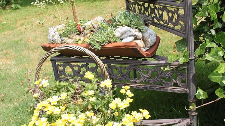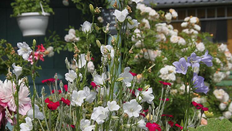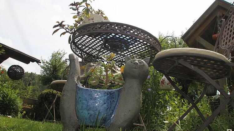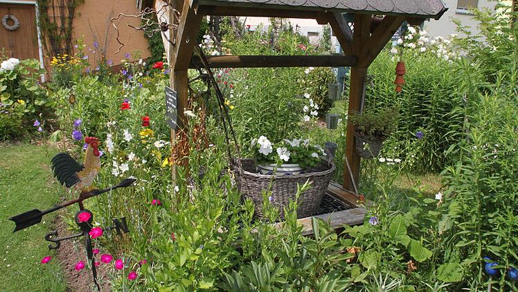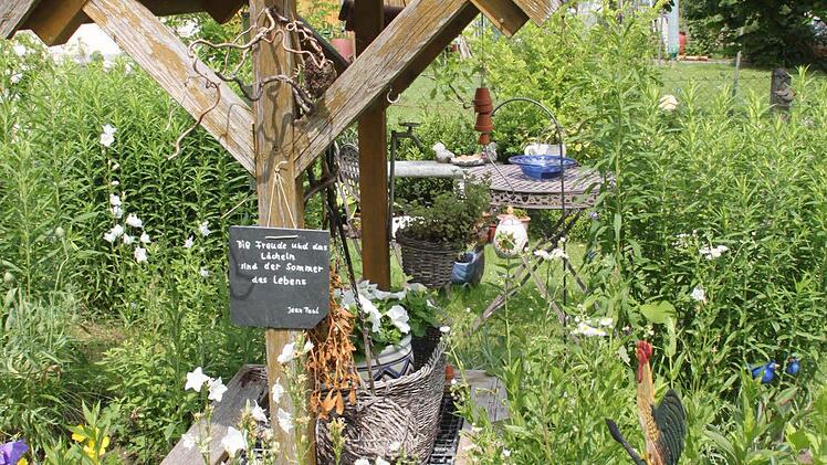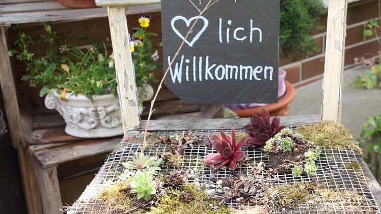 Es sind aber die vielen kleinen Dinge, die den Garten der 67-Jährigen so besonders machen: der Hauswurz, der auf den Ziegeln an der Hausseite wächst, die kleinen Schiefertafeln mit Sprüchen, der alte Stuhl mit dem Willkommensschild, den Besucher am Eingang passieren. "Ich habe eine Liebe zum Detail", erklärt Helga Küspert. Blumen und Accessoires sollen sich ergänzen.